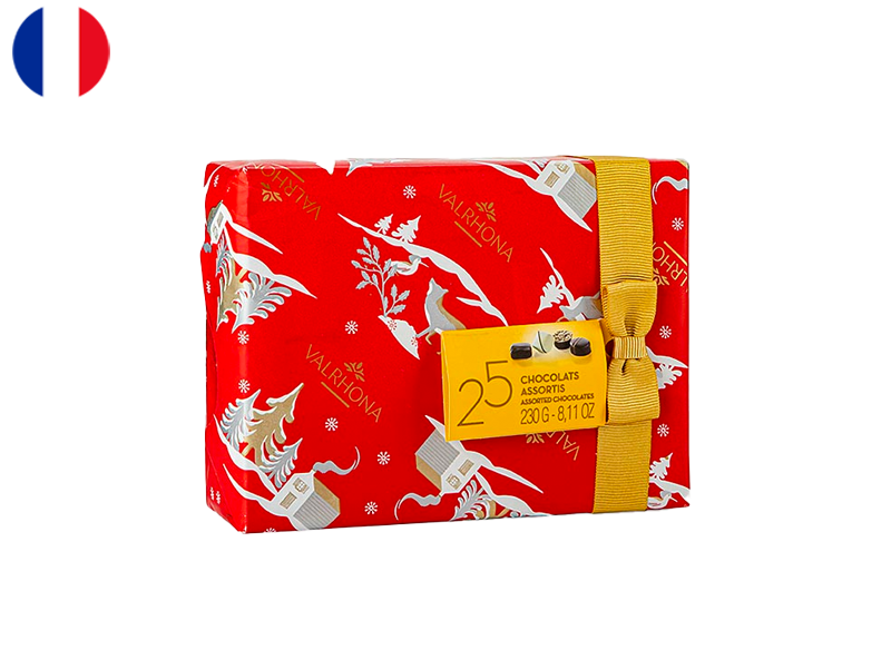 This box of chocolates features a selection of 25 sweets, including dark chocolate praline, milk chocolate, and generous ganaches. Ganache is a confection that combines chocolate and fresh cream, while praline is made with chocolate and nuts.