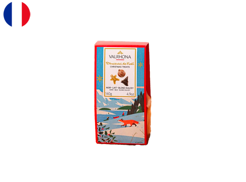 This assortment of chocolates showcases delightful shapes such as snowballs, stars, and gingerbread men. It consists of three delectable chocolate recipes: dark Caraïbe 66%, milk chocolate Caramélia, and blond Dulcey 35%.