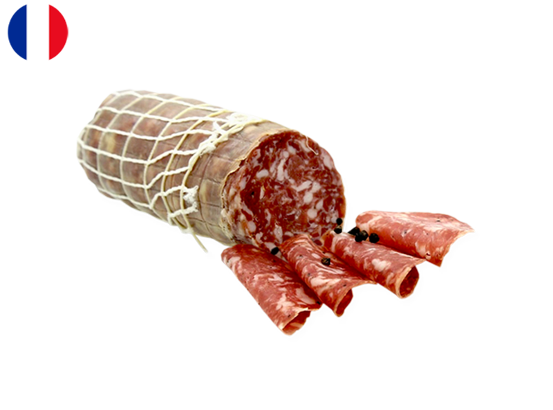 Weighing about 420g, this dry sausage is encased in a natural pork casing and hand-tied in a distinctive diamond net. Its interior reveals a vibrant rose colour with a perfect balance of lean meat and marbled fat, offering a tender, firm texture and an earthy, rustic aroma.