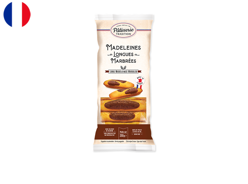 A soft long madeleine, marbled with a plain dough and a chocolate dough with real chocolate powder. A delicious gourmet recipe for all the chocolate lovers.