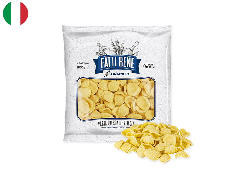 A taste of Puglia brought to life through artisanal craftsmanship, this fresh Orecchiette—meaning “little ears” in Italian—is a pasta shape that captures the soul of Southern Italian tradition in every delicate curl. Made using time-honored methods with simple, premium ingredients, each piece is formed by hand, creating a distinctive concave shape with a rough, porous texture that eagerly embraces sauces of all kinds.