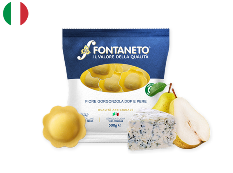 ​Fontaneto, a distinguished Italian pasta producer, offers a delectable Ravioli with Gorgonzola and Pear. This fresh pasta dish harmoniously combines the robust, creamy notes of Gorgonzola cheese with the subtle sweetness of ripe pears, encapsulated within tender ravioli.​