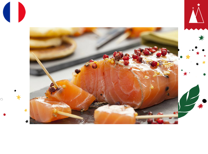 This upper back of the salmon, the softest part, is marinated in hazelnut oil, a very fine oil that will be able to penetrate deeply, and seasoned with a mixture of pink peppercorns and mustard seeds.