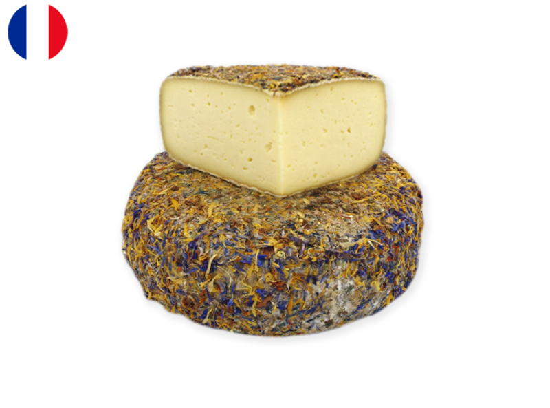 A feast for both the eyes and the palate, this Tomme de Vache aux Fleurs from Laiterie de Vichy is a true artisanal delight. Made from creamy cow’s milk, this semi-soft cheese is coated in a vibrant mix of dried edible flowers, giving it an unmistakable floral aroma and a visually stunning appearance. Beneath its colorful rind, the paste is smooth, buttery, and delicately tangy, with subtle grassy and milky notes that evolve with age. This Tomme is perfect for those who love a cheese that’s as beautiful as it is flavorful.