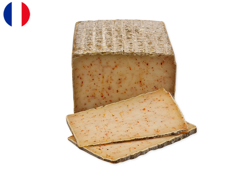 A rustic sheep’s milk tomme from the French Pyrenees, elevated by the vibrant warmth of Espelette pepper, this cheese embodies the spirit of the Basque country where tradition and flavor converge. Crafted from pure ewe’s milk using time-honored methods, the tomme develops a natural, grayish rind that gives way to a dense, supple paste with a clean, nutty sweetness and subtle notes of toasted hazelnut and wild herbs. The addition of Espelette pepper—France’s beloved PDO chili from the Basque region—adds a gentle, smoky warmth that lingers on the palate, never overpowering but perfectly complementing the cheese’s rich, milky character. Perfect for a rustic cheese board, melted over grilled vegetables, or paired with a dry Jurançon or a light red from the southwest, Tomme Pur Brebis with Espelette Pepper is a celebration of Pyrenean craftsmanship—a cheese that balances earthy elegance with a whisper of Basque heat.