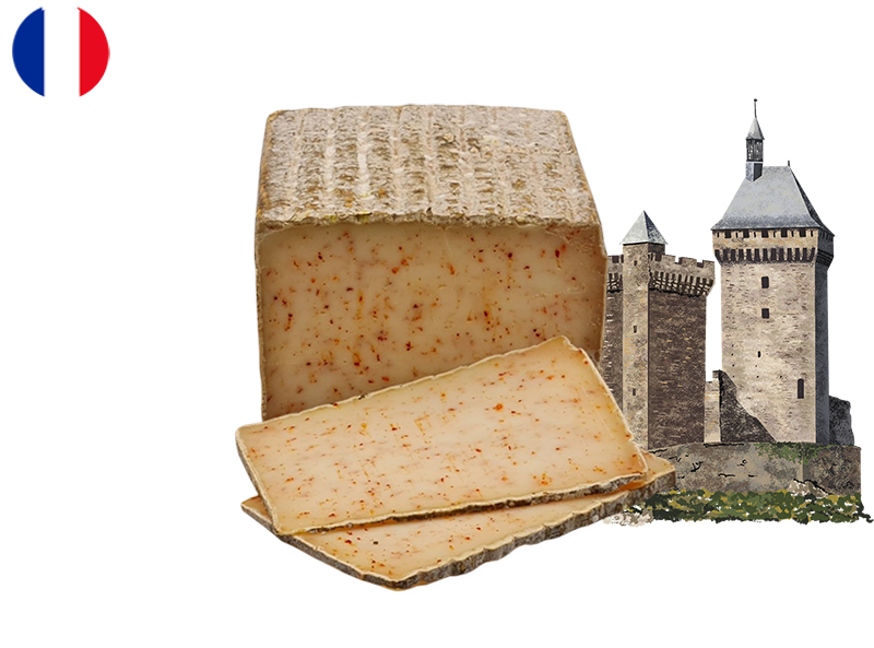 Tomme Pur Brebis with Espelette Pepper, a captivating cheese from France’s Aveyron region. Pure sheep’s milk delivers smooth, nutty richness, while Espelette pepper adds a touch of spice with subtle heat and fruity sweetness.